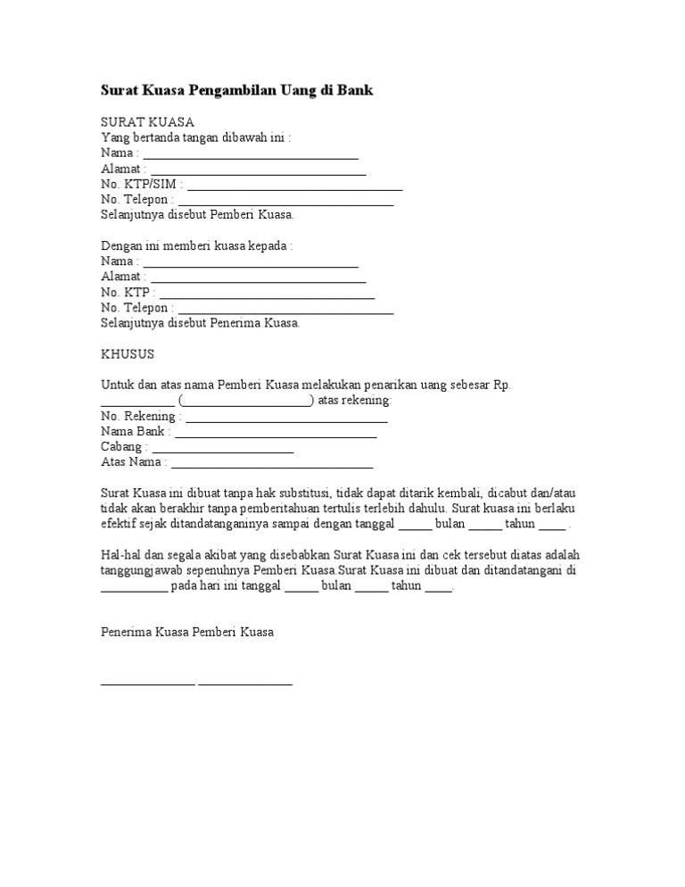 Tujuannya untuk mewakilkan pengambilan uang tunai di rekening suatu bank pada kasus ini bank mandiri kepada orang lain. Tujuannya untuk mewakilkan pengambilan uang tunai di rekening suatu bank pada kasus ini bank mandiri kepada orang lain. Sebuah surat kuasa diperlukan untuk memberikan kuasa atau kepercayaan kepada orang lain untuk mengurus suatu pekerjaan. Ada sedikit saran sih kalo bisa surat kuasa ini kita berikan. Laporan praktikum sistem respirasi pada hewan. Sementara itu, instansi bank juga memiliki format surat kuasa sendiri yang. Kop surat bri doc misalnya. Berbagai keperluan bank yang diwakilkan kepada orang lain semuanya harus menggunakan surat kuasa dari pemberi wewenang kepada penerima wewenang, misalnya saja seperti penarikan uang. Hal ini agar bank juga percaya bahwa kita memang kita memberikan kuasa untuk mengambilkan uang kita. Namun tentu saja tidak semua orang dapat mengambil uang di bank. Setiap informasi yang tertera wajib terbukti keasliannya dan tujuan surat kuasanya tercantum jelas dalam surat. 13 contoh surat kuasa untuk berbagai keperluan. Tujuannya untuk mewakilkan pengambilan uang tunai di rekening suatu bank (pada kasus ini bank mandiri) kepada orang lain.