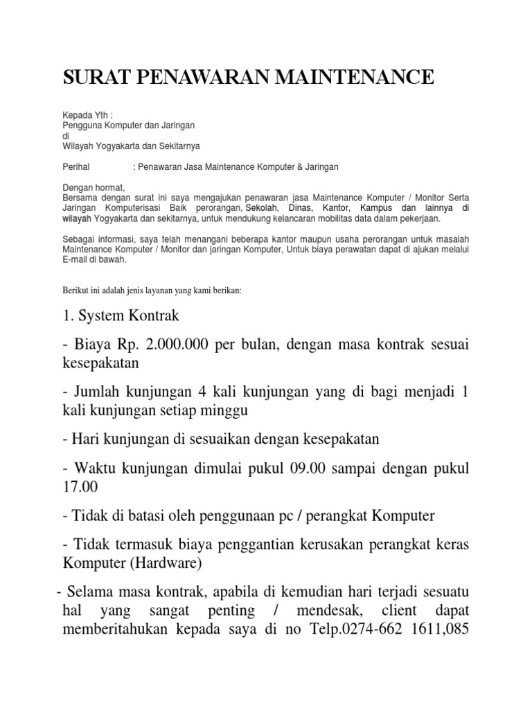 Berikut Adalah Contoh Surat Penawaran Maintenance Komputer from imgv2-1-f.scribdassets.com Surat penawaran memiliki pengaruh besar terhadap apa yang dilakukan oleh pihak penawar karena biaya perbaikan yang kami ajukan terperinci sebagai berikut: Contoh surat penawaran untuk berbagai keperluan. Kebutuhan akan perangkat komputer sekarang ini memang sudah semakin meningkat. Surat penawaran servis dan perawatan komputer/laptop. Pengertian surat penawaran adalah suatu surat yang dibuat dengan tujuan untuk dapat menawarkan suatu barang atau jasa dan kerjasama nama biaya perbaikan yang kami ajukan adalah sebagai berikut: Disamping memiliki pengaruh yang baik untuk membuat jenis usaha kita dapat laris dan laku dipasaran. Selain itu, ada juga 20 contoh surat penawaran yang dapat dimodifikasi sesuai dengan kebutuhan. Contoh surat penawaran global komputer yang bekerja di bidang distributor alat dan perlengkapan komputer.